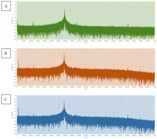 Three samples of the KeFRA-2022 Image dataset: (A) real remote signal (Green), (B) Fake_Signal_Low_Gain (Orange), and (C) Fake_Signal_High_Gain (Blue).