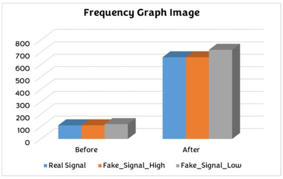 - Image augmentation: This is a process concerned with applying simple and complex image transformations in order to increase the number of data samples in the dataset. Several image transformations were applied here, including (1) random reflection axis X, (2) random reflection axis Y, (3) random image rotation using min-max degrees, (4) random image rescaling using min-max factors, (5) random horizontal translation using min-max pixels, and (6) random vertical translation using min-max pixels. Since the number of images in the accumulated dataset is relatively small, with a small frequency for each class (340 images in total distributed in 110 images for the real signal, 110 images for the fake signal with high gain, and 120 images for the fake signal with low gain). Therefore, the images in the dataset have undergone the image argumentation phase to increase the number of images and improve the learning process of the employed classifier. The images were subject to six transformation processes, including (1) random reflection axis X, (2) random reflection axis Y, (3) random image rotation using min-max degrees, (4) random image rescaling using min-max factors, (5) random horizontal translation using min-max pixels, and (6) random vertical translation. This, in turn, has resulted in increasing the frequency of images for each class by a factor of 6. The following figure shows the frequency graph image before and after augmentation. Figure 4 shows the frequency graph image of the classes contained in the dataset before and after applying image argumentation processes. The total number of images before and after the data argumentation (using 6 different transformations): (1) before the data argumentation, 340 images, and (2) after the data argumentation, 2040 images;