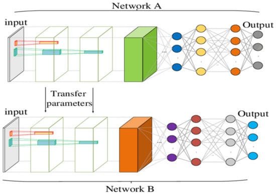 In this subsystem, we leverage the transfer learning technology to gain the benefits of the pre-trained deep convolutional neural networks. In transfer learning, a model developed for a task is reused as the starting point for a model on a second task. However, fine-tuning is required for the learning hyperparameters employed by pre-trained CNN to accommodate the new learning tasks [32]. Figure 5 shows the main idea of the transfer learning technique where the core part of network A (transfer parameters) is frozen and transferred to network B. The adjustment will be performed at the hyperparameters of the output fully connected layer that is tuned to accommodate the output for the new classification task (at network B).