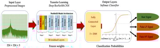 In this work, we are utilizing the transfer learning of ResNet-50 CNN, which is pre-trained on the ImageNet dataset [33] after preprocessing the collected dataset to fit into the input layer of ResNet50. Fine-tuning for the network hyperparameters at the output layer is performed to accommodate the output of our three-classes classification task in this research (real signal, fake signal high gain, and fake signal low gain). Figure 6 demonstrates the developmental stages of the proposed learning model subsystem. Once the images are preprocessed and resized to 224 × 224 × 3, they are fed through the 50 frozen residual layers. Finally, proper tuning and other learning parameters are performed for the fully connected layer and classification layer.