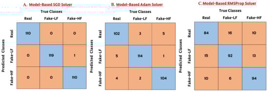 Confusion matrix analysis for the proposed transfer learning based ResNet50 model using three optimizers (solver) techniques: (A) using SGD solver, (B) using Adam solver, and (C) using RMSProp solver.