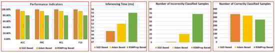 Furthermore, Table 2, along with Figure 8, compares the three models (model-based SGD solver, model based-Adam solver, and model-based- RSMProp solver) in terms of seven performance indicators, including the number of correctly classified samples (NCC = TP + TN), the number of Incorrectly classified samples (NIC = FP + FN), the overall detection accuracy (ACC), the overall detection precision (PRC), the overall detection sensitivity/recall (RCL), the overall detection harmonic mean/F1 Score (F1S), and the overall detection (inferencing) overhead/time (INF). Based on the results obtained from the confusion matrix and the other evaluation metrics, it can be clearly seen that the model-based SGD solver outperforms other models in all the performance factors. However, inferencing time shows very close values as it is mainly affected by a deep convolutional neural network (i.e., ResNet50) with a slight difference impacted by changing the solver algorithm.