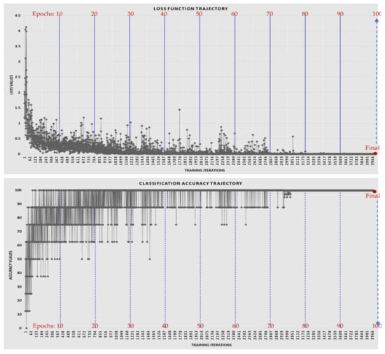 Based on the earlier evaluation and analysis, the model-based SGD solver is selected to be deployed in the final detection model. Therefore, the next results will focus on the detection of fake replay attack signals on remote keyless controlled vehicles using pre-trained ResNet50 CNN with the SGD solver technique. Moreover, Figure 9 illustrates the classifier performance plots for the loss function and classification accuracy trajectory for 100-epochs training using the SGD solver technique. According to the figure, both evaluation metrics (i.e., loss function and classification accuracy) consistently advance along with the evolving training epochs. Nevertheless, the detection loss function showed a decreasing tendency toward the minimum loss (i.e., zero MSE). In contrast, the detection accuracy function exhibits an increasing tendency toward the highest possible detectability (i.e., 100% accuracy). Moreover, both functions appeared to be saturated after almost 75 training epochs recording an error value of ≤0.5% and an accuracy rate of ≥99.5%.