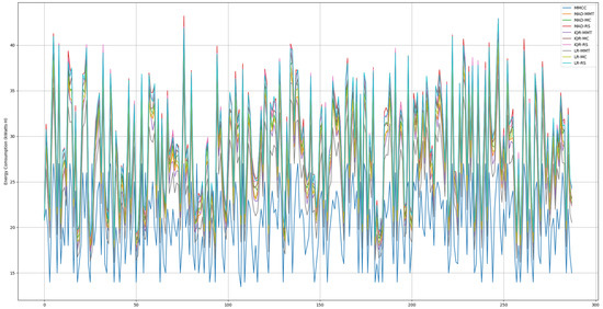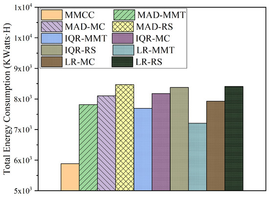 Figure 8 shows the host energy consumption for each time slice of the day when all the methods are used to perform server consolidation. Figure 9 compares the total host energy consumption over the day when all the methods are used to perform server consolidation. From Figure 8, it can be seen that the host energy consumption generated by MMCC is less than that of the baseline methods in most of the time periods. From Figure 9, it can be seen that the total host energy consumption generated by MMCC in a day is about 10% less than that of LR-MMT (the best in the baseline methods) and is about 43.9% less than that of MAD-RS (the worst in the baseline methods). In a cluster composed of multi-core processor hosts, MMCC can effectively schedule tasks among multiple cores to optimize energy consumption.