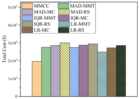 Figure 14 shows and compares the total cost generated by all the methods in one day. MMCC outperforms the baseline methods. For instance, the total cost generated by MMCC is about 20.9% less than that of LR-MMT (the best of the baseline methods) and about 34.4% less than that of MAD-RS (the worst of the baseline methods). MMCC can not only optimize the energy consumption in the environment of multi-core processor hosts, but also reduce the SLAV in server consolidation through the host load detection and VM selection strategies based on the prediction method.