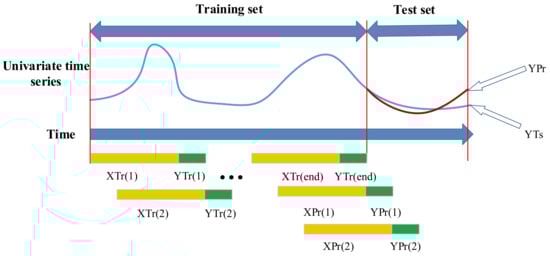 In Figure 1, the whole single variable time series is divided into training set and test set, and in the training set, the last position of the time window is used as the response for rolling training. In the test set, the entire test set is set as unknown, and the end of the training set is used as the input to predict the first datapoint, YPr(1), of the test set, and then YPr(1) and the end of the training set are reorganized into XPr(2) to predict the next point, YPr(2). This rolling cycle continues to achieve multi-step prediction of the target trajectory and output YPr.