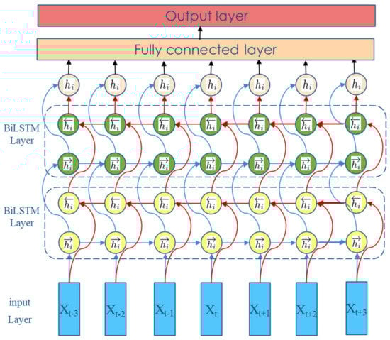 The Bi-LSTM structure is shown in Figure 2. The Bi-LSTM is composed of the same composition as the LSTM network, but it is trained twice on the input data from left to right and from right to left [32].