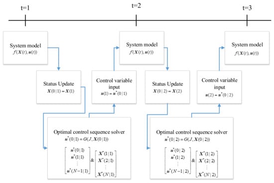 In the presence of disturbances and constraints, model predictive control is a process control method that uses a system model to predict the future state of the system and generates a control vector [33]. The control vector minimizes or maximizes an objective function within the prediction horizon; the first element of the computed control vector is used as the system input and the rest is discarded at each point in time. This process is repeated the following moment. The main flow is depicted in Figure 3.