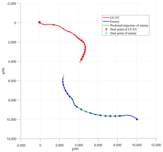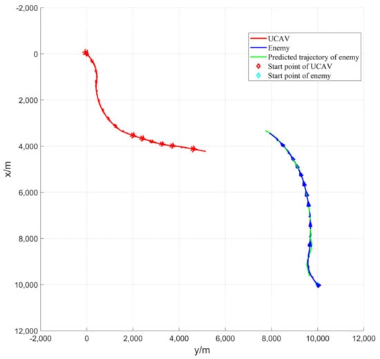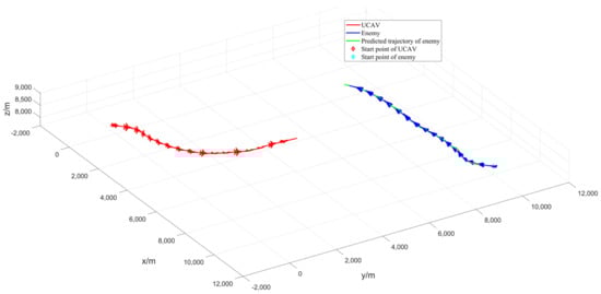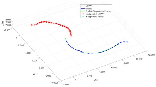 As shown in Figure 14, the three-dimensional trajectory of the UCAV and the enemy and the predicted trajectory of the enemy lasted for 46 s. Within 41–46 s, the enemy is in the inescapable missile zone of the UCAV for 5 s. Finally, the UCAV wins the air battle. As shown in Figure 14, both the UCAV and the enemy perform a left turn maneuver, but the UCAV performs a larger left turn and then a quick right turn. However, the UCAV makes a large left turn and then a quick right turn, whereas the enemy aircraft makes a small left turn followed by a near level flight and then a right turn, giving the UCAV the first opportunity to win the air battle.