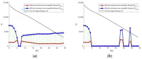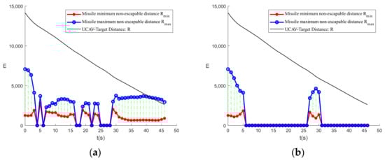 UCAV-enemy relative distance and missile inescapable distance curve. (a) UCAV; (b) enemy.