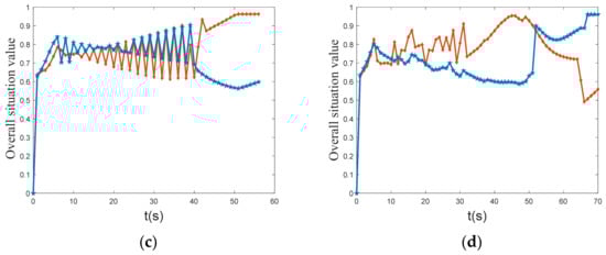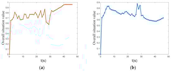 Figure 17 depicts the curve of UCAV and enemy overall situation value. The graph shows that the initial value of the overall situation of UCAV and enemy is similar. In the middle stage, the overall situation value of the enemy is clearly higher than that of the UCAV, but after 30 s, the overall situation value of UCAV increases rapidly, while the overall situation value of the enemy aircraft decreases. Finally, the overall situation value of the UCAV is stable at approximately 0.96, and the overall situation value of the enemy is stable at approximately 0.62. The UCAV’s situation value is significantly greater than the enemy’s, and it eventually wins the air combat.