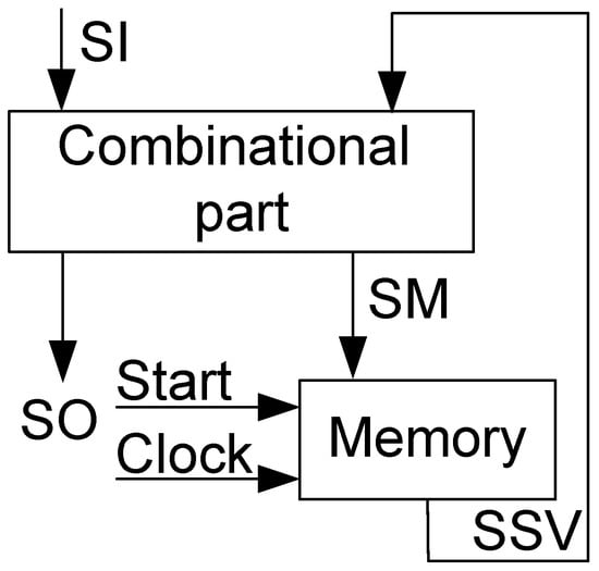 A Mealy FSM logic circuit consists of a combinational part and memory []. The memory is represented by the RG. The combinational part is represented by the following systems of Boolean functions (SBFs) []: