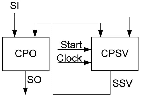 If either the relation or is true, then it is enough to have a single CLB to implement functions (19)–(21). In this case, there is only a single level of CLBs in the second-level circuits of FSM . If the relation takes place, then the circuits of CPO1 and the CM are multi-level.