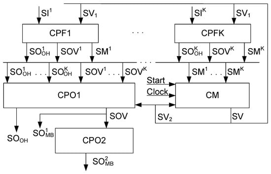 The structural diagram of FSM includes three levels of logic blocks. Each of them is implemented using LUT-based CLBs. A block CPFk implements SBFs (19)–(21). They represent the first logic level of the FSM circuit. This level is responsible for generating partial functions of outputs and IMFs. A block CPO1 generates SBFs (22) and (23). This block can be implemented using multiplexers created from basic LUTs and dedicated multiplexers of CLBs []. In this case, the multiplexer control inputs are connected with the class variables , whereas the data inputs are connected with wires corresponding to partial functions. In the best case, some outputs are represented as single literal functions . A block CM implements SBF (24). Its circuit is implemented in the same way as it is for CPO1. This block includes a hidden register controlled by pulses and . The blocks CPO1 and CM represent the second logic level. Finally, the third logic level is represented by a block CPO2. This block generates outputs represented by SBF (25).