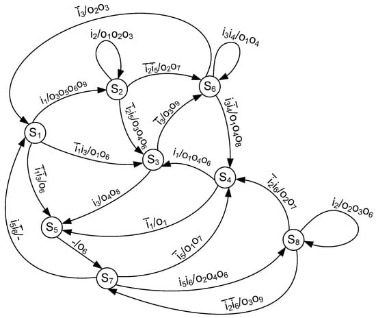 In many cases, either a state transition graph (STG) or a state transition table (STT) is used to represent the behavior of the Mealy FSM []. Using these forms, the three following sets can be derived: a set of states , a set of inputs , and a set of outputs . Therefore, an FSM has G states, U inputs, and W outputs. In the case of STG, its vertices correspond to states, and arcs correspond to interstate transitions. Above each arc, there are written FSM inputs causing a particular transition and outputs associated with this transition []. An STT represents an STG as a list of transitions, where each line corresponds to a particular transition. Therefore, if there are H arcs in an STG, then there are H lines in a corresponding STT. For example, some FSM is represented by an STG shown in Figure 1.