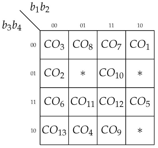 To use SLUTs in the circuit of CPO, we propose to represent the set of outputs as two non-overlapping sets. The set includes outputs represented as (4). Therefore, these outputs are represented by unitary codes. The set consists of outputs represented as (10). Therefore, its elements are encoded by maximum binary codes. Now, the outputs are encoded by unitary-maximum (UM) codes. Here, we used the idea from [], but we modified this approach. We propose to form the set in a way to fulfill the condition: