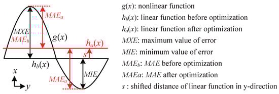 As shown in Figure 2, when the maximum and minimum error values (MXE and MIE) are not balanced, MAE can be decreased. The error e in the segment can be expressed as