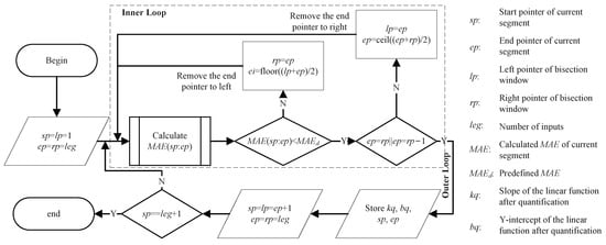 The procedure of the segmentor in [30] is illustrated in Figure 3. The segmentor divides the given nonlinear function into several segments subject to a predefined MAE constraint, . The MAE of the hardware circuit based on the segmentor result must be no larger than . When calculating , the segmentor also considers the quantification operation. The quantification errors are also included in the calculated MAE in addition to the segmentation errors.