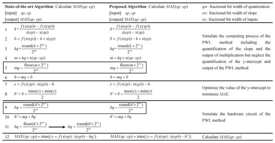 In [28], a universal segmentor for the PWL method was proposed to choose the smallest number of segments that can satisfy the predefined MAE requirement of the software. Ref. [29] further optimized the segmentor in [28]. In addition, a quantizer used to determine the smallest fractional bit width under the MAE constraint of the hardware circuit has been proposed. To improve the segmentation and quantification performance, these quantification operations are embedded into the segmentor in [30]. Although the segmentor in [30] is designed for logarithmic computations on floating-point numbers, it can easily be used in the computation of other nonlinear functions, such as logarithmic, exponential, reciprocal, square root and inverse square root functions.