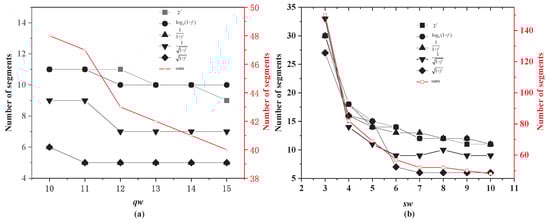 Although the segmentor used in [30] is designed for the implementation of logarithmic computations on floating-point numbers, it can easily be generalized to any unary function. The critical procedure of such a segmentor is the calculation of , which is the optimized part of our design. As shown in Figure 4, we first translated the segmentor in [30] so that it is suitable for our design. In our design, the fractional word length of the output corresponds to that of the input, iw. The output was rounded to a fractional bit width iw in line 11 of Figure 4. This operation reduces the error but incurs extra hardware overhead compared to truncation methods. We used different values of qw in the segmentor to divide the five target nonlinear functions into various numbers of segments. The relationship between qw and the number of segments is illustrated in Figure 5a. The number of segments decreases with an increasing qw.