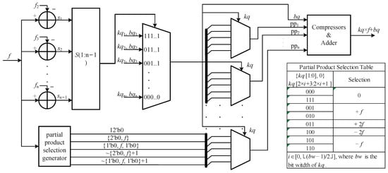 To reduce the area and power consumption and improve the calculation density, we introduced reconfigurable technology to reuse computing resources among different functions. For this purpose, the bit widths of the multiplications and additions for all functions must be unified. Therefore, all of the functions were segmented with the same sw. As shown in Figure 5, the number of segments greatly increases when sw is less than 6. Therefore, we set sw to 6 to divide the five functions into 57 segments. Based on the bit widths of kq, sw and the outputs shown in Table 1 and Table 2, the proposed multifunction architecture with the reuse of computing resources is illustrated in Figure 13. The starting points of all segments for each function were combined as to , where the first number in the braces indicates the number of the corresponding function. To unify the bits of to , n was set as equal to the largest number of segments among the five functions, which was 15 in our design. If the number of segments is fewer than 15, the significant bits are filled with the starting point of the last segment. The function selection code op was used to determine the starting points of the 2nd to nth segments for the corresponding function. Similar to the circuit in Figure 8, the input f and were compared by several adders. The signs of the comparators and op serve as the selection signals of the multiplexer to locate the inputs for the corresponding segments of the corresponding function. In addition, kq and bq were determined. The other parts of the multifunction architecture with the reuse of computing resources, as shown in Figure 13, are the same as those of the proposed architecture for single functions shown in Figure 8. Additionally, the Booth encoding method was used to generate the partial products in Figure 9f. In accordance with Figure 9f, the compressor is illustrated in Figure 14.