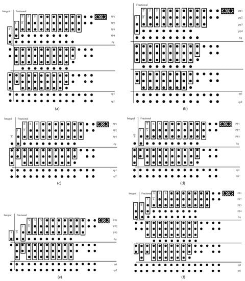 Partial products with sign extensions and bq in the implementations for (a), (b), (c), (d), (e) and multiple functions with the reuse of computing resources (f). Rectangular boxes indicate full or half adders. Rectangular boxes with slashes indicate that the bits are abandoned. pp1 to pp5 represent the partial products of the Booth multiplier. S is the sign bit of the partial product.