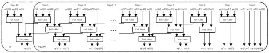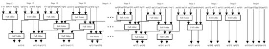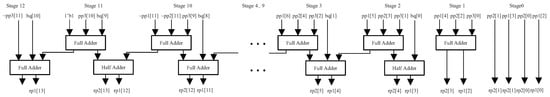 Then, our task was to obtain the sum of the partial products and bq. In our design, they were compressed to two results. The two results of the compressors were added by an adder. In the traditional Booth multiplier, the sign bits fill in the most significant bit (MSB) to ensure that the partial products are left-aligned. However, the filling with sign bits can be reduced by means of the sign extension method [37]. The compressor and adder implementations are related to the lengths of bq and the output, as shown in Table 2. The integral and fractional parts of the partial products and bq are aligned in Figure 9. In accordance with Figure 9a, the compressor in the circuit is illustrated in Figure 10. The sum of the partial products and bq is the result of this circuit, whose range and bits are shown in Table 2. The result for requires only 10 fractional bits. However, the two least significant bits (LSBs) of pp1 are not different from the preceding 10 fractional bits. Therefore, they were directly abandoned. In stage 0 of the compressor, only two inputs, pp1 and pp2, were involved. They were sent to rp1 and rp2 without any treatment, where rp1 and rp2 are the two outputs of the compressor. In stage 1, the three inputs, pp1, pp2 and pp3, were compressed into two results. A full adder can realize this task. In stage 2, the four inputs are pp1, pp2, pp3 and bq. A full adder and a half adder were used to compress these inputs into two results and a carry. In stage 3, pp1, pp2, pp3, pp4 bq and the carry in stage 2 were compressed into two results and two carries by two full adders and one half adder. In stage 4, three full adders were used to compress pp1, pp2, pp3, pp4, bq and the two carries into two results and two carries. Stages 5 to 10 have the same functions and units as stage 4. In stage 10, the 11th bit of the partial product is the sign bit, according to the symbol S in Figure 9. In stage 11, the number of inputs is decreased. Two full adders and one half adder were needed to implement a compressor with inputs consisting of 1, pp3, pp4, bq and the two carries from stage 10. In stage 12, pp3, pp4 bq and the two carries from stage 11 are the inputs. Two full adders were needed. Because only one integral bit is useful in the output, the high-order bits were abandoned. As seen from Figure 9a,b, the compressors for and have the same inputs. However, their outputs have different integral bits. Therefore, the integral bits of were directly abandoned. Hence, stage 12 for was omitted in the implementation for . As shown in Figure 9c,d, the compressors for and have the same inputs. Therefore, the hardware implementations of the compressors for and are the same as in Figure 11. As shown in Figure 12, the simple hardware implementation of the compressor for is a result of the reduced number of partial products compared with the other functions. Finally, an adder was used to compute the sum of the two compressor results. After truncating the result of the adder to 10 fractional bits, the output of the proposed circuit was obtained.