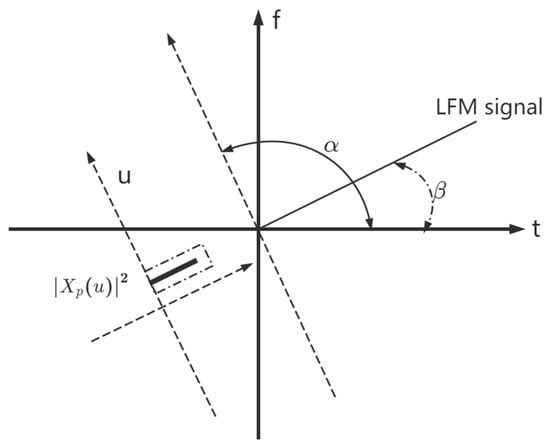 The important relationship between FrFT and WVD is given: the projection of the linear integral of the WVD of a signal over the fractional domain is the square of the FrFT magnitude of that signal over this fractional domain. The WVD of the LFM signal is a straight line which has a maximum magnitude only in the projection at a point in the fractional domain perpendicular to it []. When the axis is rotated by an angle so that the LFM signal () forms an impulse in the fractional Fourier domain, then , is the optimal rotation angle found [], as shown in Figure 2.