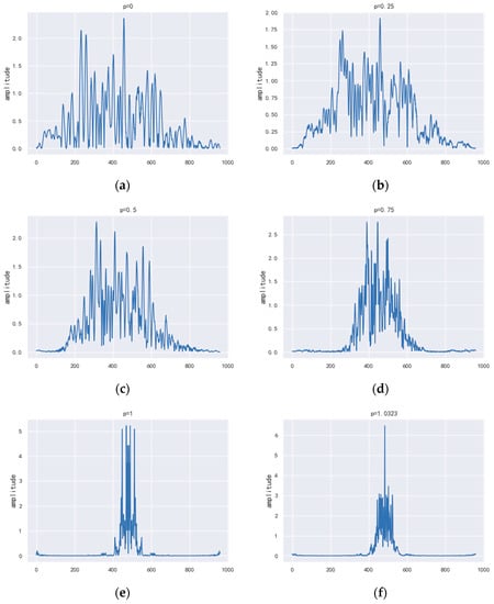 The magnitude of FrFT of speech signal for various orders (domains). (a) the magnitude of the transform in the = 0 domain; (b) the magnitude of the transform in the = 0.25 domain; (c) the magnitude of the transform in the = 0.5 domain; (d) the magnitude of the transform in the = 0.75 domain; (e) the magnitude of the transform in the = 1 domain; (f) the magnitude of the transform in the optimal order= 1.0323 domain.
