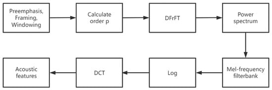 - The discrete cosine transform (DCT) of the logarithmic energy of the filter bank is calculated to obtain 13 static Mel-Frequency Cepstral Coefficients (MFCCs), and the first-order differential and second-order differential are further calculated to obtain first-order dynamic features and second-order dynamic features, for a total of 39 acoustic features. The formula for calculating the dynamic characteristics is as follows []:where is the first-order dynamic features, is the cepstrum coefficient, and typically K = 2. By replacing by one can similarly derive the second-order dynamic features.The framework of the new MFCC extraction algorithm is shown in Figure 4.