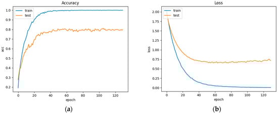 Meanwhile, the weighted accuracy (WA) and unweighted accuracy (UA) were calculated in this experiment to evaluate the model’s performance []. The WA is often used to evaluate the system’s expected performance, whereas the UA is often used to assess its ability to discriminate between classes. The experiment achieved 79.86% WA and 79.51% UA. Initially, it can be seen that the experiment yielded good results.
