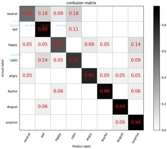 Furthermore, a confusion matrix was generated to show the classification results of each emotion more clearly. The confusion matrix on the RAVDESS dataset is shown in Figure 7.