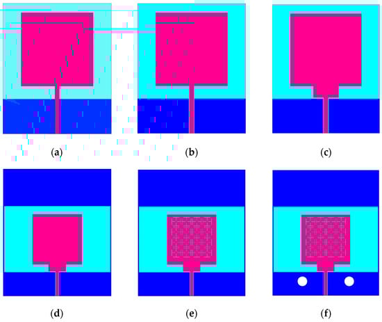 Design steps of UWB antenna: (a) Ref. Antenna; (b) first step; (c) second step; (d) third step; (e) Pro. Antenna; (f) perforated antenna model.