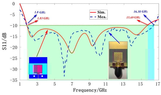 Figure 6 shows the comparison curves between the simulation and test results for the reflection coefficient of the UWB antenna. The green line in Figure 6 represents S11 = −10 dB. The simulated working area of the antenna is the light green area, from to , which can completely cover the 3.1–10.6 GHz required for UWB communication. The blue dashed line is the curve obtained by the vector network analyzer. The measured band is 1.8–16.38 GHz, the absolute bandwidth reaches and the relative bandwidth is up to . At the same time, it can be observed that the test curve of the reflection coefficient basically matches the trend of the simulation curve, and the working band has been expanded to a certain extent, which is related to the loss compensation function of the vector network itself, and the error is mainly due to the manual welding of the antenna sample adapter, the slight movement of the antenna sample during the test, and the wear and tear of the test connection itself.