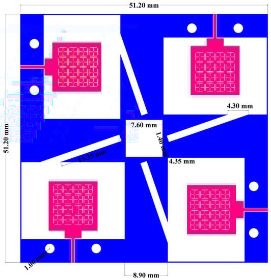 The UWB antenna is used as a unit cell and the four cells are rotated symmetrically at the center by the polarization diversity technique, introducing four decoupled slits on the metallic ground to form the UWB MIMO antenna in Figure 8. The quad-port MIMO antenna is printed on the single side of the F4B substrate and the overall size is .