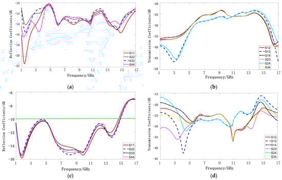To illustrate the role of introducing strips in reducing the coupling, the S-parameter simulation results without introducing strips are given in Figure 9c,d. The green line in Figure 9 represents S11 = −10 dB. Comparing Figure 9a,c, it can be seen that the reflection coefficients at each port of the MIMO antenna have better similarity when the strips are not introduced, and the return loss depth of the antenna at low frequencies is deepened and the impedance bandwidth is expanded to some extent after introducing strips. Comparing Figure 9b,d, it can be seen that the isolation of the antenna at both lower and higher frequencies is improved after introducing strips, especially at <4 GHz and >14 GHz. These are both observed in Figure 9, indicating that the coupling can indeed be reduced by introducing strips.
