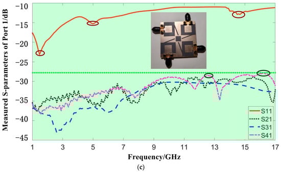 The simulated S-parameters of the MIMO antenna at port 1 after adding the decoupling slit are shown in Figure 10b, as can be seen from the reflection coefficient curve, the antenna operates at 1–17 GHz with an absolute bandwidth of 16 GHz and a relative bandwidth of 177.78%. The green dashed line in Figure 10b,c represent the maximum value of the transmission coefficients in the working area, which can be judged as the minimum value of the isolation. From the transmission coefficient, it can be seen that the isolation between the ports all exceeds 23.42 dB, and the isolation effect is improved, especially when the antenna works below 4 GHz and above 14 GHz, the isolation degree is improved obviously, and the simulated isolation degree between different ports is shown in Table 2.