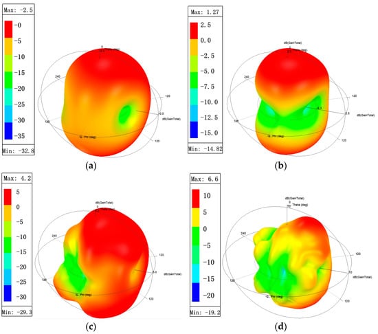 Three-dimensional radiation patterns of proposed MIMO antenna at: (a) 3 GHz; (b) 6.16 GHz; (c) 10.6 GHz; (d) 14.92 GHz.