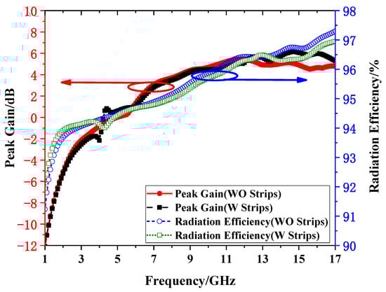 Figure 13 gives a 3D radiation pattern for these four frequency points, which allows one to visualize the radiation properties of the antenna. Figure 14 shows the gain and radiation efficiency of the MIMO antenna for the two cases with and without the addition of the metal strip. It can be seen that the values of the gain and efficiency of the MIMO antennas are almost unaffected by the introduction of the strip to increase the isolation, and the trends of the variations almost coincide. The gain and radiation efficiency of the proposed MIMO antennas are favorable for the whole operating band. The gain steadily increases to a maximum of 7.81 dB and the radiative efficiency is always stable between 90% and 98%.