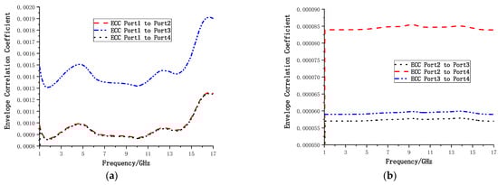 From Figure 15a, it can be seen that the ECC of port 1 to port 2 (ECC12) and port 1 to port 3 (ECC13), and port 1 to port 4 (ECC14) is less than 0.002 within the operating frequency, especially the ECC between ports 1, 3, and 1,4 are less than 0.0013. In Figure 15b, it can be seen that the ECC of ports 2, 3, and 4 is less than 0.00009, and the ECC of port 2 to port 3 (ECC23) and port 2 to 4 (ECC24) is less than 0.00006, and the ECC of all ports is less than 0.002, which satisfies the requirements of MIMO system for MIMO antenna correlation parameters [23].