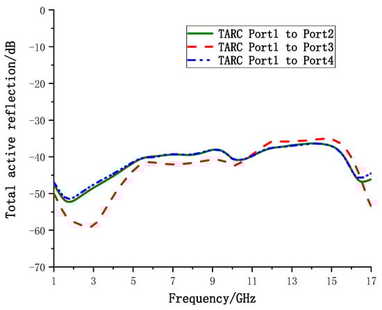 In the ultra-wideband range, the TARC is guaranteed to be <−10 dB at a minimum [29]. It can be seen from Figure 18 that the TARC from port 1 to port 2 is between −52.28 dB and −36.34 dB. The TARC from port 1 to port 3 is between −59.13 dB and −35.08 dB, and the TARC from port 1 to port 4 is between −51.46 dB and −36.41 dB. All TARCs are below −35 dB, which ensures low coupling effects and channel independence between receiver and transmitter in MIMO systems.