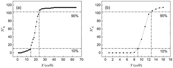 Bit1 area was irradiated and the number of incident ions N was 100. According to the known conversion relationship between logical addresses and physical addresses, the two-dimensional distribution of all upset cells was drawn in Figure 3. The cell arrangement of every bit area is 64 columns × 16 rows, a total of 1024 cells. Since the aspect ratio of each cell is about 1:4 (0.52:2.17 precisely), each bit area is approximately a square. The upset counts were projected to the X and Y directions respectively, and N′X and N′Y were then obtained by the accumulation of upset counts. The results are shown in Figure 4. The distances along X and Y direction corresponding to 10–90% of the total upset counts are defined as the width and height of the beam spot respectively, which is shown as 4.8 μm × 7.8 μm. The linear interpolation at adjacent two points in Figure 4 was used to get numerical values. This result is marked with a red solid frame in Figure 3. The number of ions included in this part accounts for 86% of the total. The red dashed frame in Figure 3 represents the most conservative estimate of the beam spot size including all upsets, with a size of 10.9 μm × 15.2 μm.
