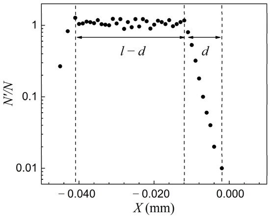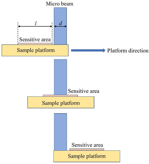 The SRAM device moved from left to right horizontally at a given step length as shown in Figure 5. The numbers of incident ions and upsets occurring at each position were N and N′. The step length was set to be 1 μm. The horizontal width of the beam spot and the sensitive area were defined as d and l, respectively.