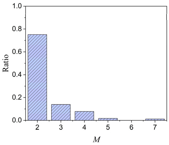 In Figure 6, N′N > 1 in the central area indicates that a single incident ion causes more than one cell to upset, which means there is a certain proportion of MCUs. The distribution of multiplicity M is shown in Figure 7. Most of the MCUs are two-bit MCUs while the maximum of M is seven. This is a common result in most MCU works [4,9,10]. There are also some studies that analyze different patterns of MCUs [9,10], but few of them explain the probability difference of these MCU patterns, especially for the most common two-bit MCUs.