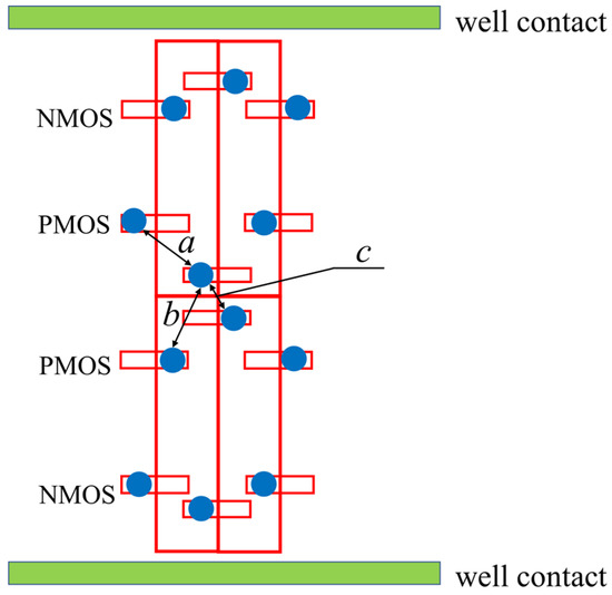 The ratio of two-bit MCUs with different upset patterns are shown in Table 1. The probability of pattern (a) is largest both in our work and refs [9,10]. However, the probability of pattern (b) is larger than (c) in ref [9], while it is the opposite in ref [10]. Our result is consistent with ref [10]. Here, we provide a possible explanation that the different probabilities of these three patterns are due to the geometric distribution of the sensitive area within adjacent cells as shown in Figure 8. The scale of geometric dimensions in Figure 8 is consistent with the real layout for comparison. The drain areas of MOSFETs in OFF state are sensitive, which are marked as blue dots in the figure. The spacings a, b and c correspond to the MCU patterns (a), (b) and (c) respectively. It is obvious that the smaller the spacing, the greater the probability of MCUs.