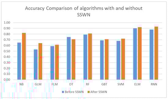 Table 9 demonstrates the significant performance improvement obtained using a majority of the classifiers. By incorporating SSWN, the performance of all algorithms except for NB DT increased, i.e., these two algorithms did not show any significant improvement in their performance. Whereas RNN here, again, shows the second-best performance in terms of accuracy and precision and best performance in terms of F-measure.