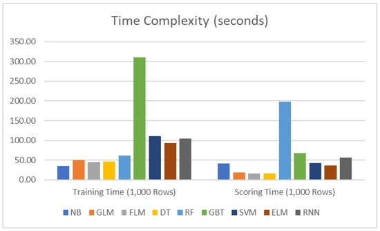 The performance of all selected algorithms is also compared with respect to the time taken by the models for training and assigning the sentiment scores. Figure 6 shows a detailed comparison of the performance of algorithms in terms of time taken in seconds for training and scoring. NB took minimum time for training while FLM was the fastest while sentiment scoring. Overall, ELM and RNN were found to perform well with respect to accuracy combined with time complexity.