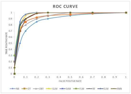 Figure 7 demonstrates a performance comparison of the selected algorithms in the form of a RoC curve plot, which shows that ELM outperforms others in terms of correct classification of the input samples.
