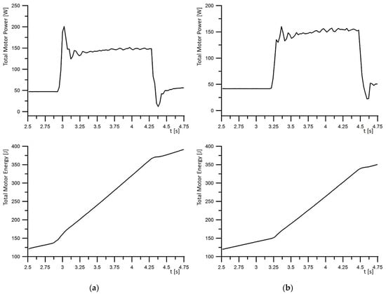 Because the entire program for controlling the thickness of the OGV airfoils of the robotic station includes over 3000 movement instructions, and the execution time is approx. 15 min, the method of selecting accelerations and speeds is illustrated by a simplified real example. Let us assume that the robot’s TCP is moved from P1 to P2 (these are the TCP robot trajectory points). Figure 2a shows the point motion parameters such as speed and acceleration, power consumed by the system, and total energy. By changing the motion parameters of the point, namely increasing the speed and decreasing the acceleration value, we can reduce the energy consumption of the system (Figure 2b).