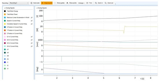 In the following subsections, the paper presents solutions using Log Signals to monitor and record quantities such as velocity and linear and angular acceleration of robot elements, values of forces, and moments, both driving and resulting from contact, e.g., a tool workpiece. Unfortunately, only one article [] concerning the accuracy and noise immunity of the IMU sensor installed on a robot was found in the literature on the Tune Master Log Signals software application available to the authors.